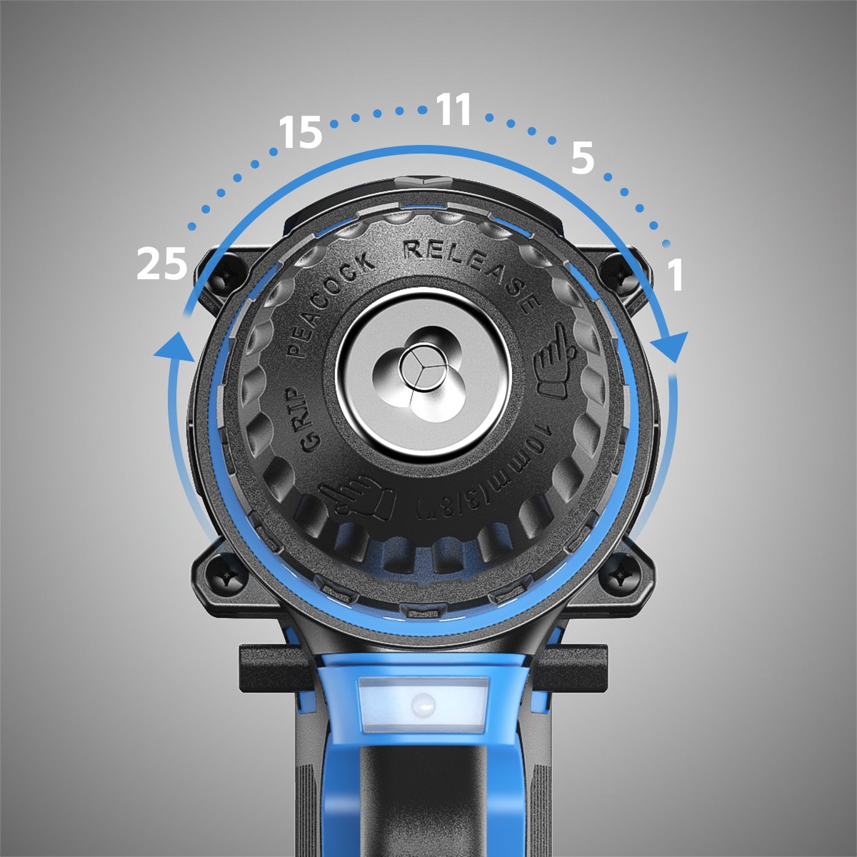 Prevent stripping and overdriving with 25+1 clutch settings. Deliver exactly the right force for materials from softwood to metal with up to 30 N·m of torque.