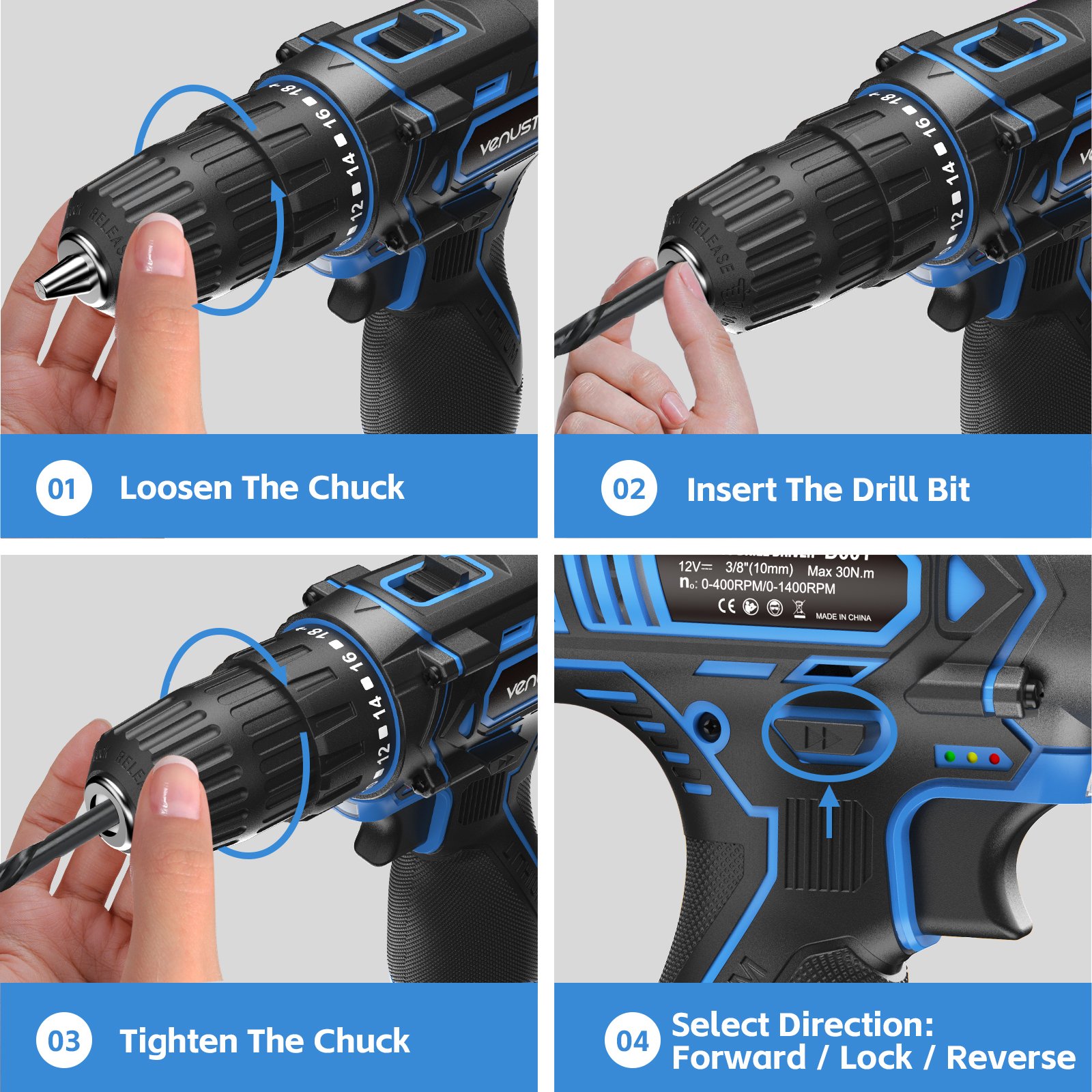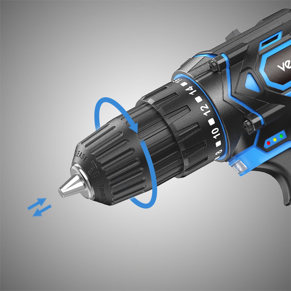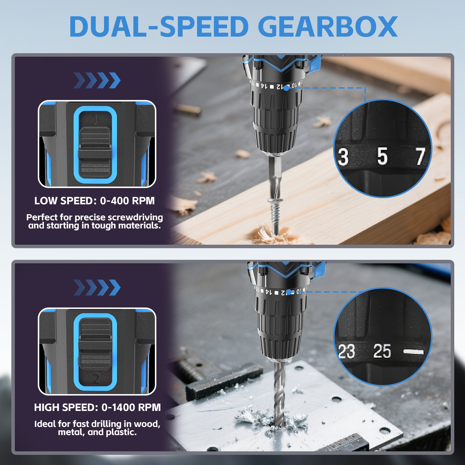 • Dual-Speed Control:Switch between two optimized ranges on this electric drill cordless: 0-400 RPM for screwdriving, 0-1,400 RPM for drilling. This cordless electric drill’s dual-speed control handles everything from softwoods to tough metals
