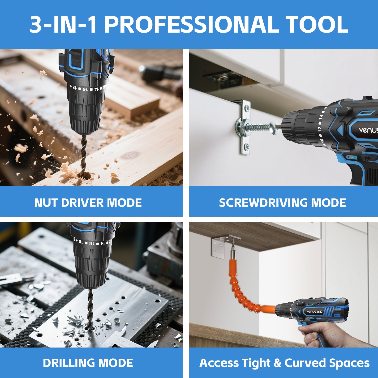• Effortless Home Projects:Ideal for home improvements, this small cordless drill handles easily. Use this small drill to work with wood, metal, and plastic – perfect for furniture assembly and renovations with your reliable drill cordless