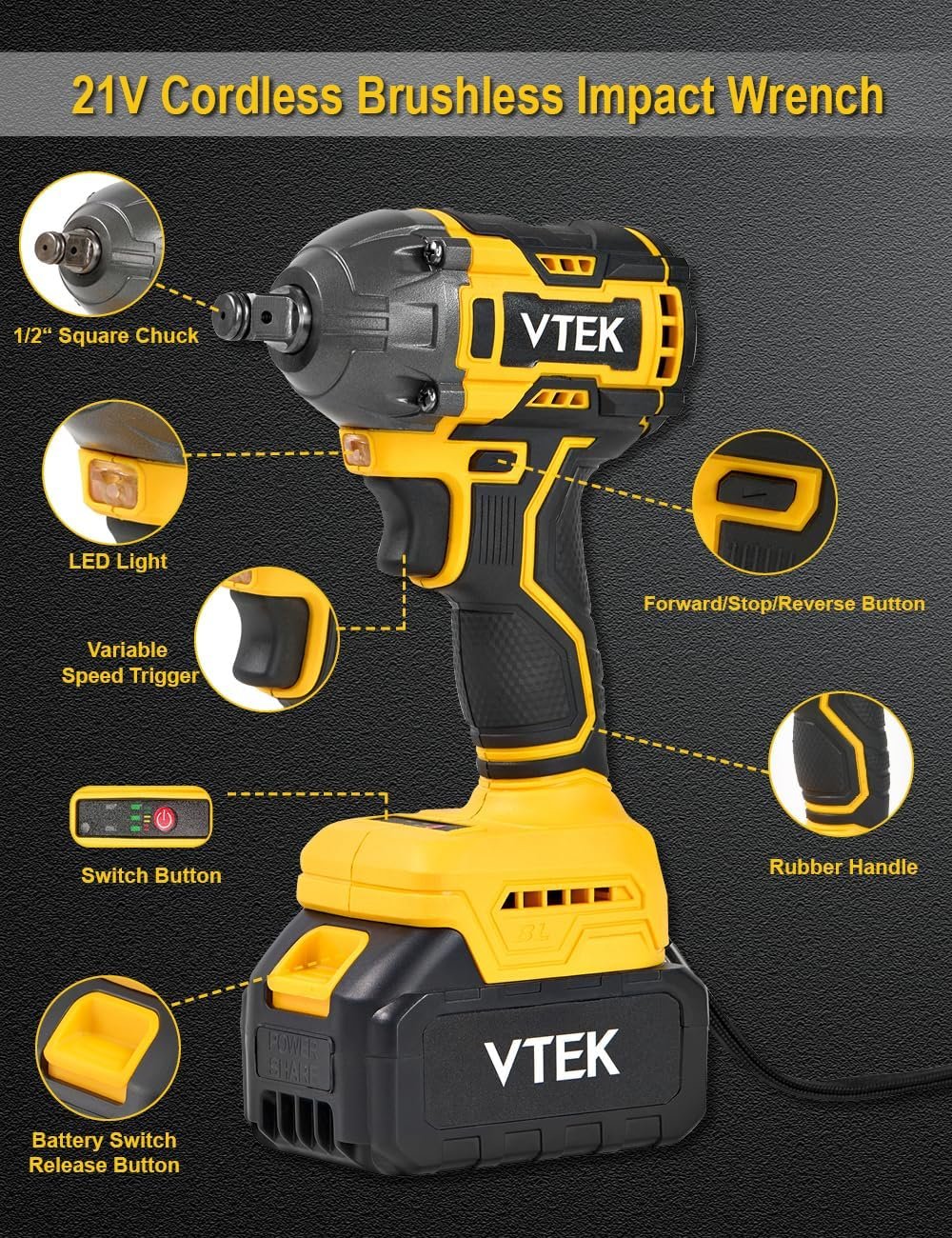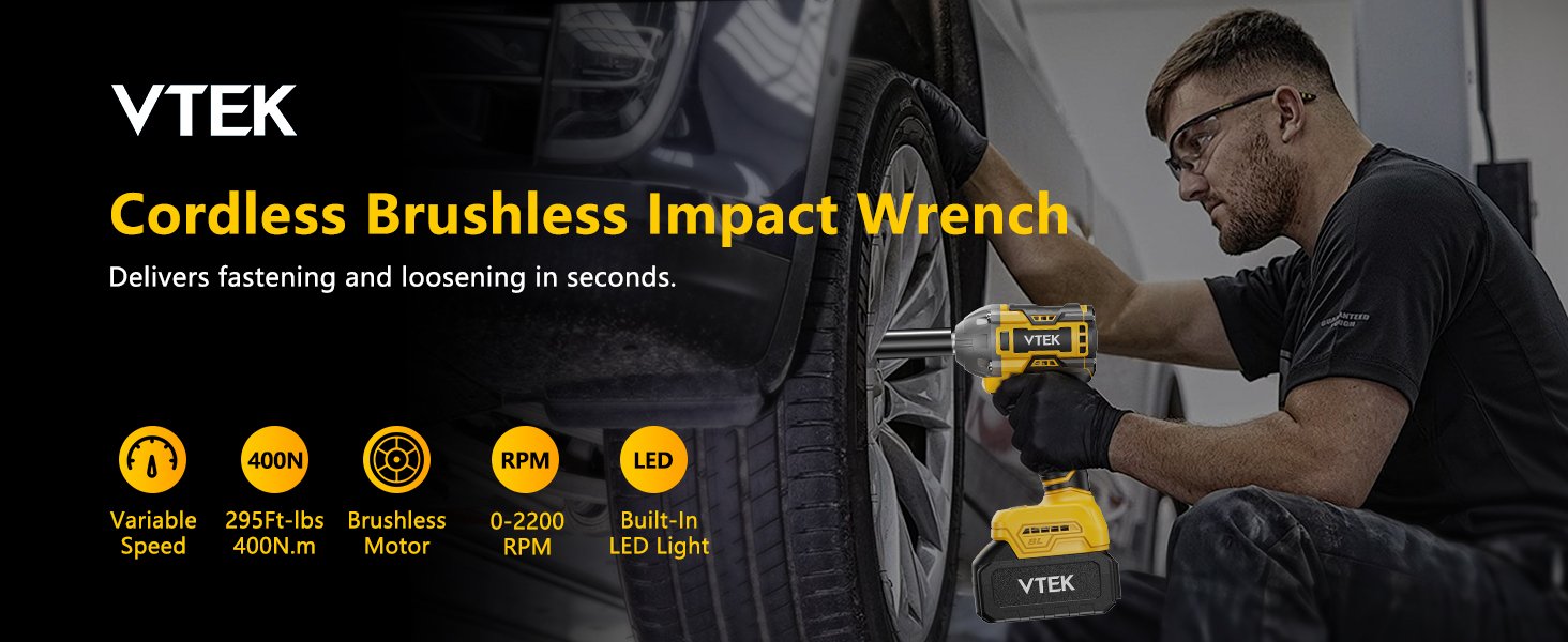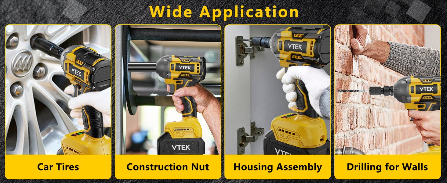 - Wide application: the brushless impact wrench from VTEK is suitable for various working situations, such as car repairs, DIY work and product assembly. Thanks to its compact and cordless design, the high torque impact wrench easily reaches tight spaces that are inaccessible to others.