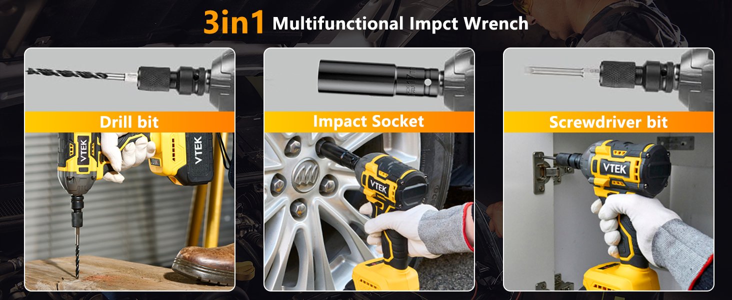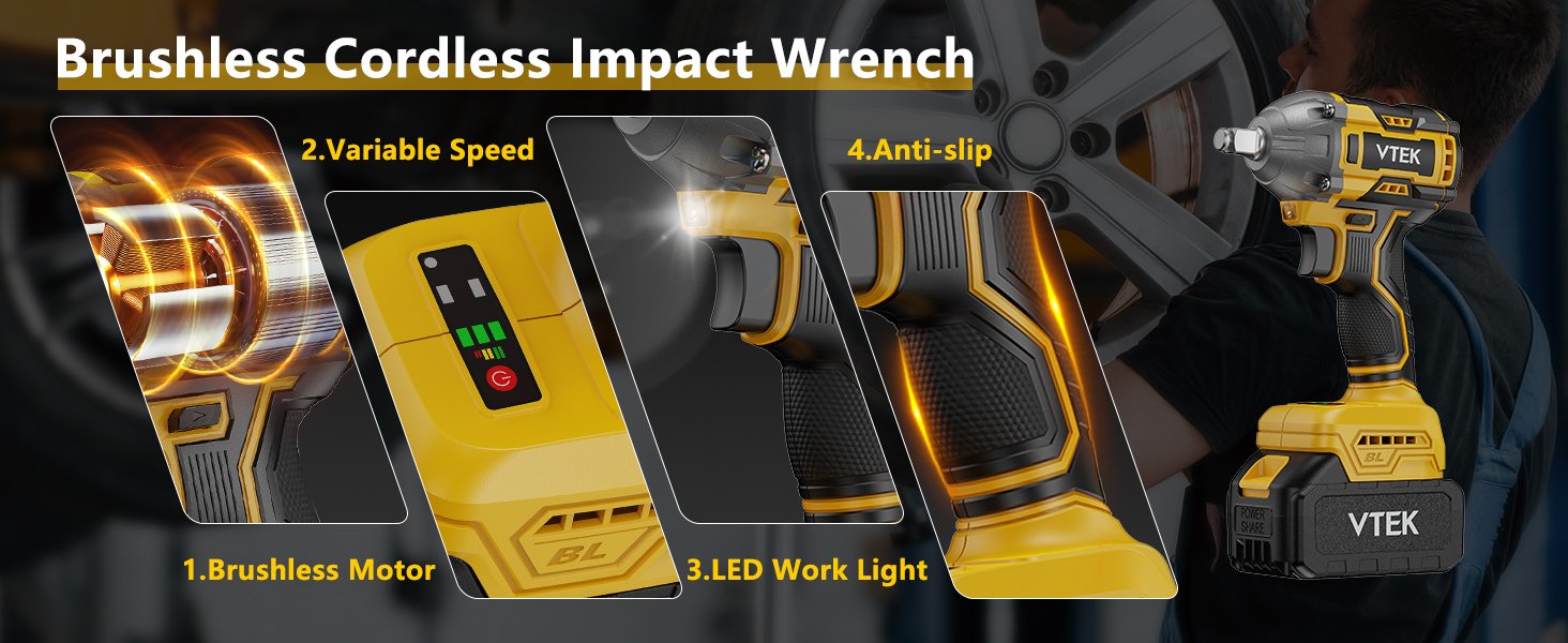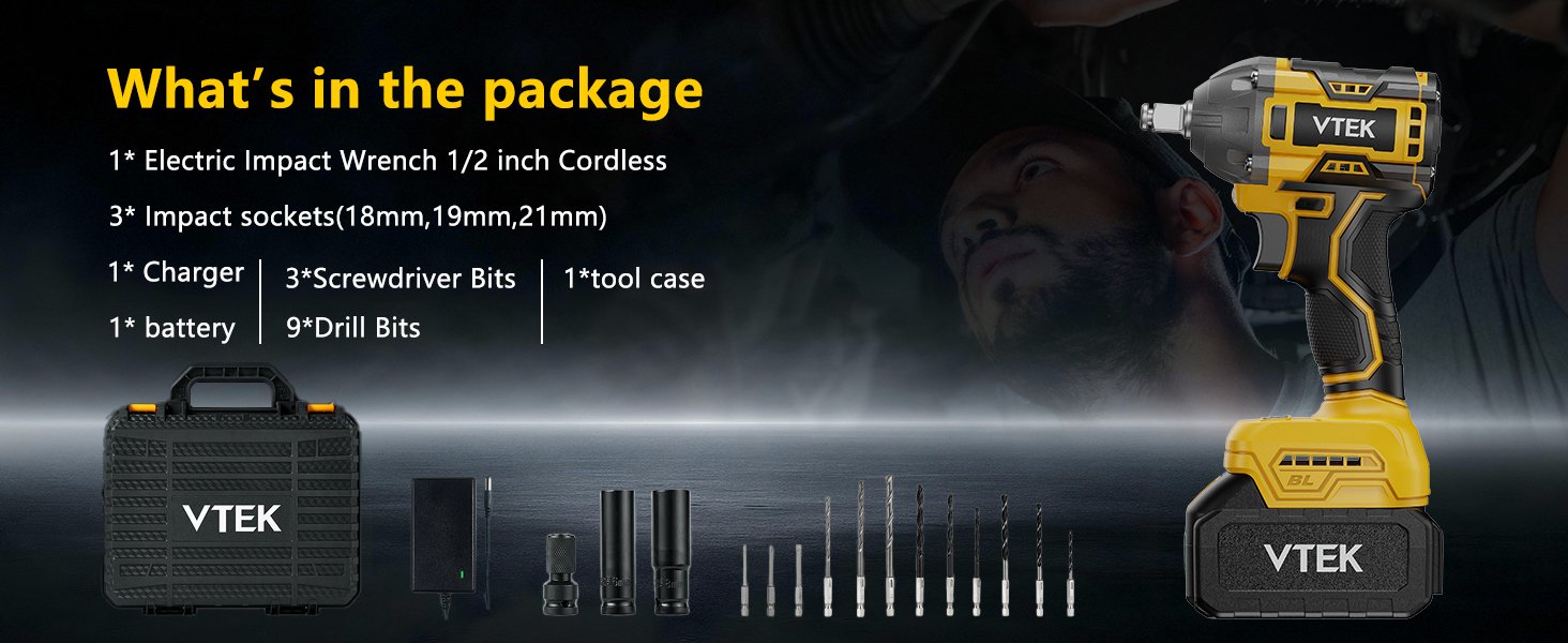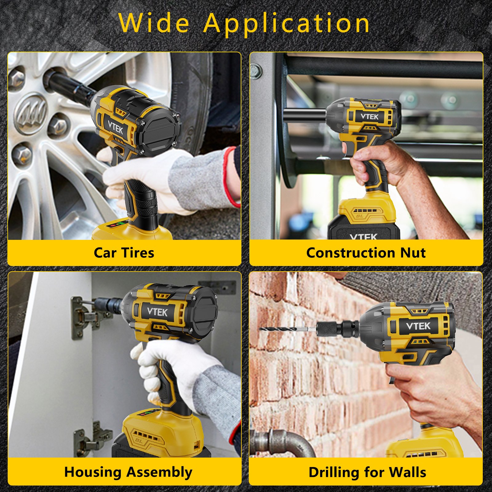 - Wide application: the brushless impact wrench from VTEK is suitable for various working situations, such as car repairs, DIY work and product assembly. Thanks to its compact and cordless design, the high torque impact wrench easily reaches tight spaces that are inaccessible to others.