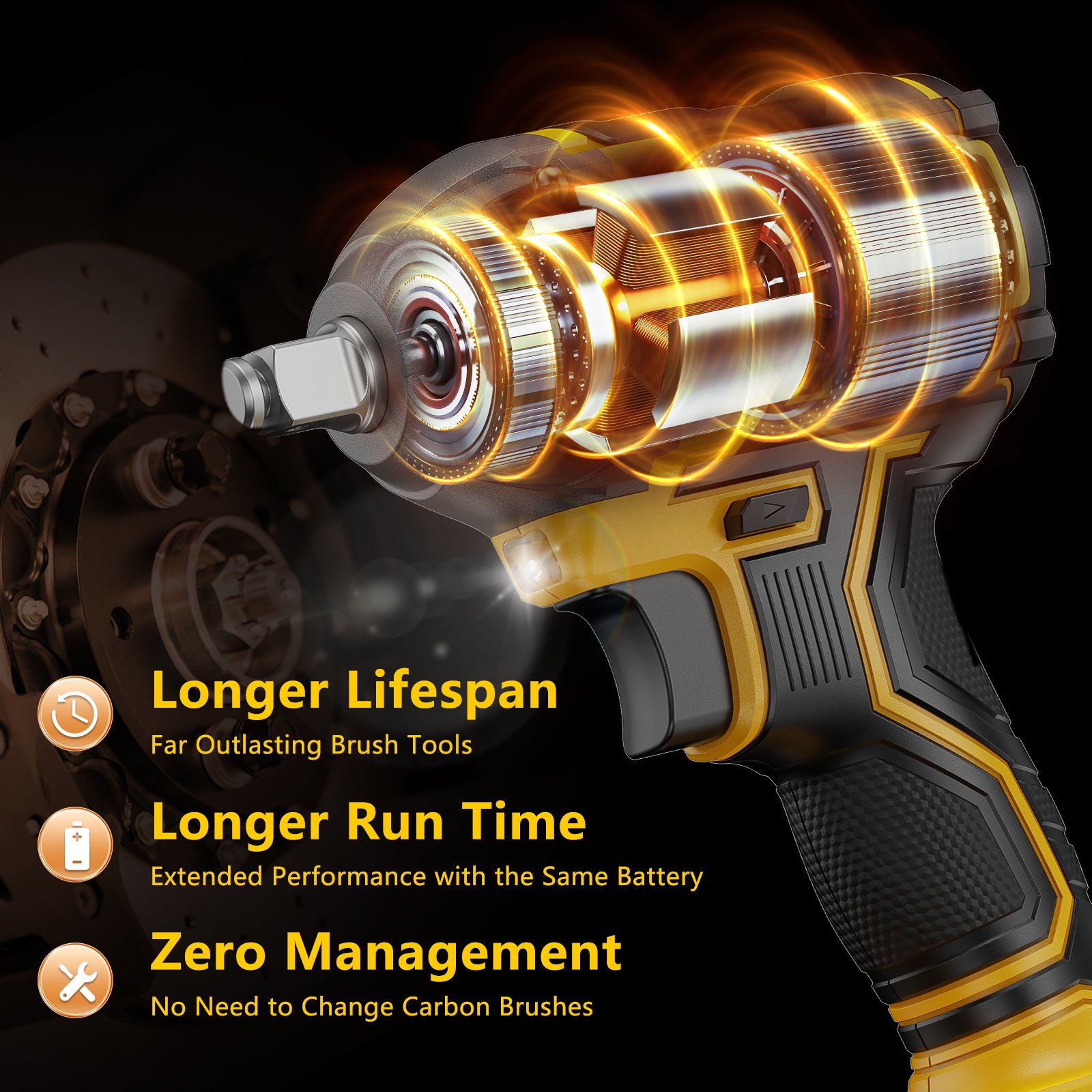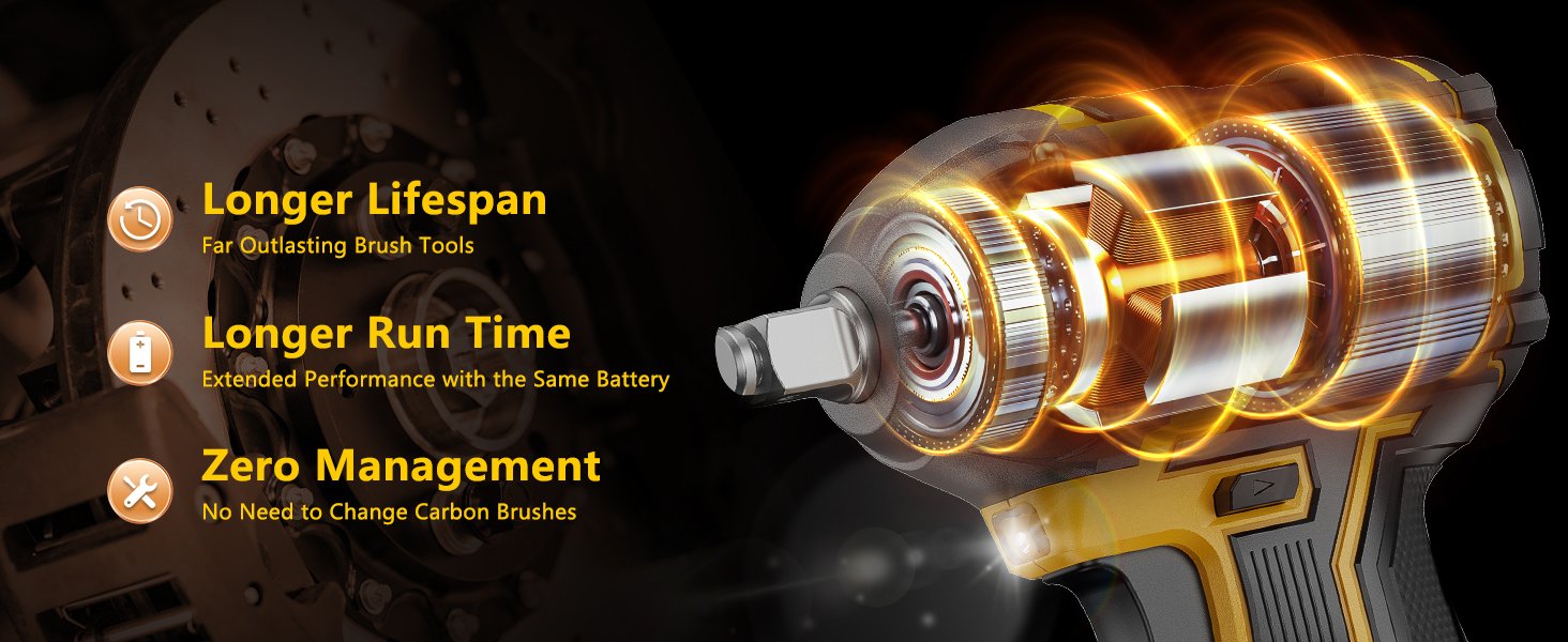 - Variable speed and brushless motor: With the variable speed trigger, you can easily control the speed of your electric impact wrench from 0 to 2300 rpm. The Brushless Motors 1/2-Inch impact wrench offers superior performance and durability. The brushless motor not only provides less noise and no sparks, but is also twice as powerful as the conventional brush motor.