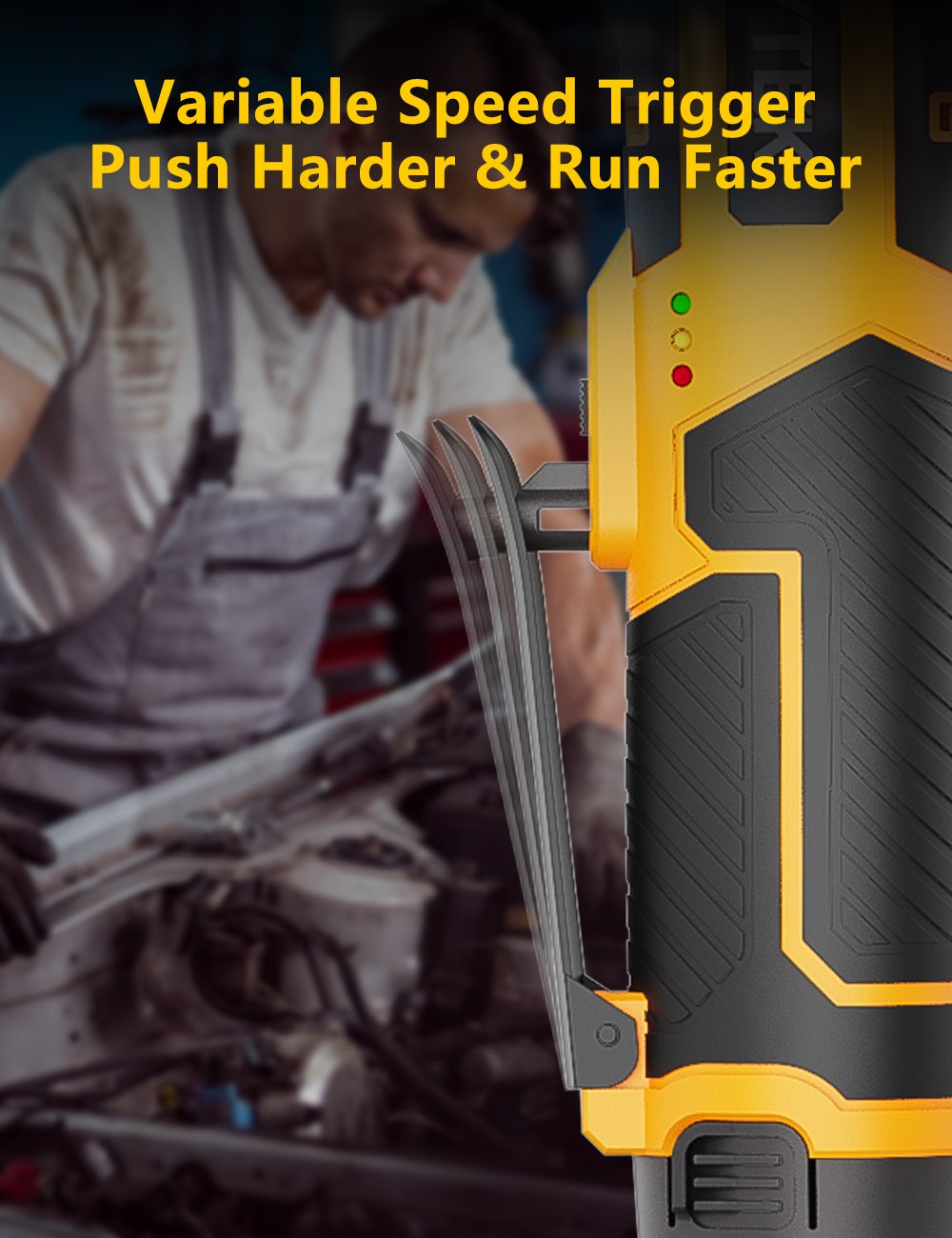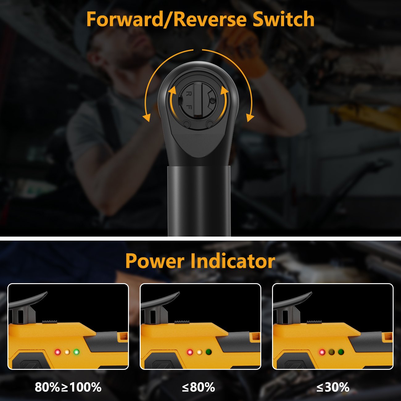 - 【Power Indicator & Built-in LED】Three Colored LED Lights Indicate Remaining Battery Level, Reminds you When You Have to Charge the Ratchet. Battery Ratchet Wrench Has built-in LED Work Light Also, Illuminates the Work Area While Working